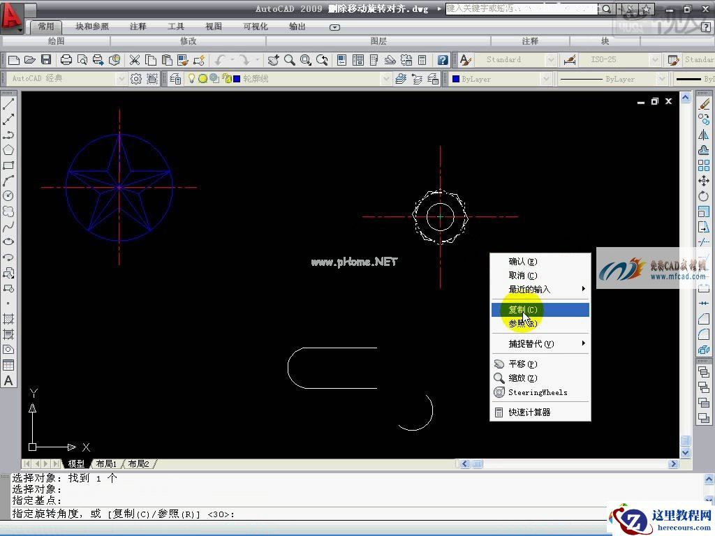 第三步:旋转对象。点击旋转按钮,选择正六边形作为旋转对象,并指定六边形中心点为旋转基点,在屏幕内拖动光标即可看到正六边形在以基点为圆心旋转。可以指定旋转角度旋图形。再次执行旋转命令,并选择正六边形,指定中心点为基点,右键选择复制选项,再次在屏幕内点击,即可将六边形旋转复制。#p#分页标题#e#