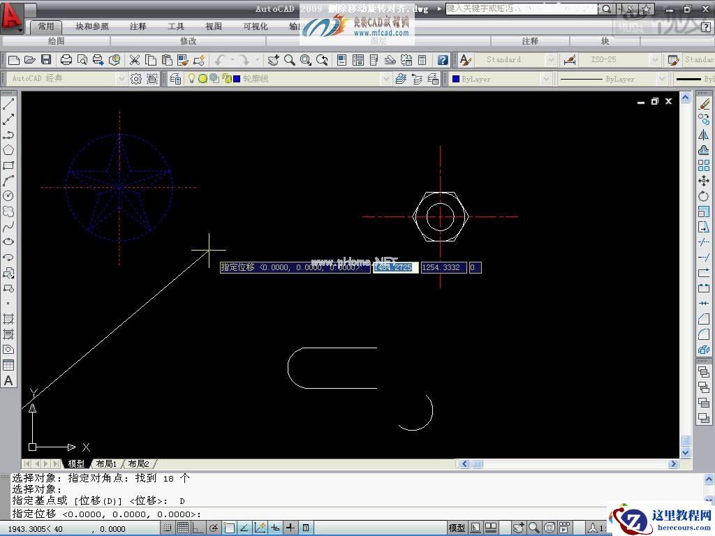 第二步:移动对象。点击移动工具,选择要移动的对象,按照命令行提示,指定基点,拖动光标,在需要的位置点击,即可完成图形移动。重复执行移动命令。右键选择“位移”选项,或在命令行中输入字母D,通过输入坐标值指定位移即可完成移动,这种方法不常用。