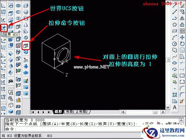 8、在长方体的一个面上画好圆后,用拉伸命令,对这个圆进行拉伸,拉伸的高度为1,倾斜度为0。 拉伸完成后,点击“世界UCS”按钮,退出对长方体一个面的UCS控制。
