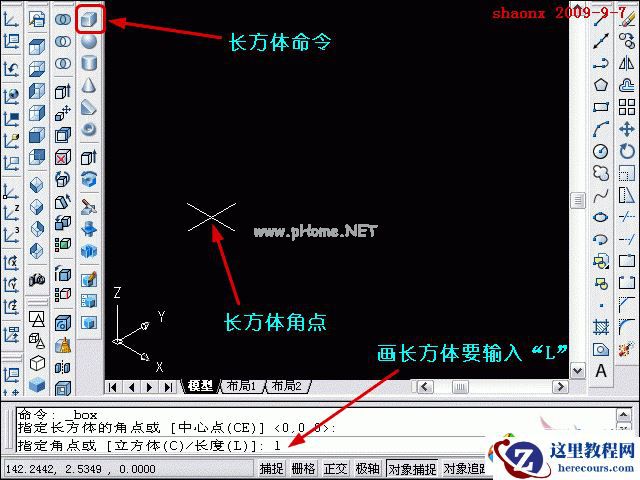 3、接着,输入“长宽高”的尺寸,前面的教程已讲过,“ 长宽高”对应UCS的坐标为XYZ。