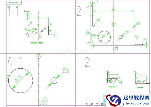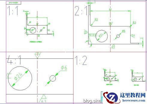 图1为设置了1:1、2:1、4:1、1:2四种比例的同一个图形,可见其中的中心线因比例的不同,在2:1、4:1、#p#分页标题#e#1:2三个视口中都成了一条直线。