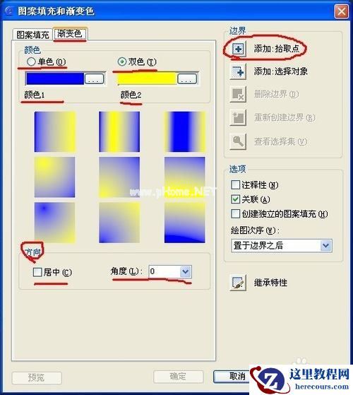 选择选择好颜色, 可以选择方向,角度,然后就可以点击添加:拾取点,然后在密闭图形内点击回车,出现对话框,再点击确定就可以了