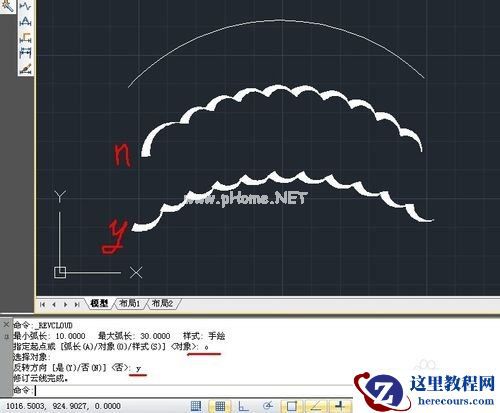 4对象:点击云线命令后,输入O回车,点击图上的一条弧线,然后弧线会变成云线,这时不输入默认不反向,输入Y回车得到的是反向的云线。