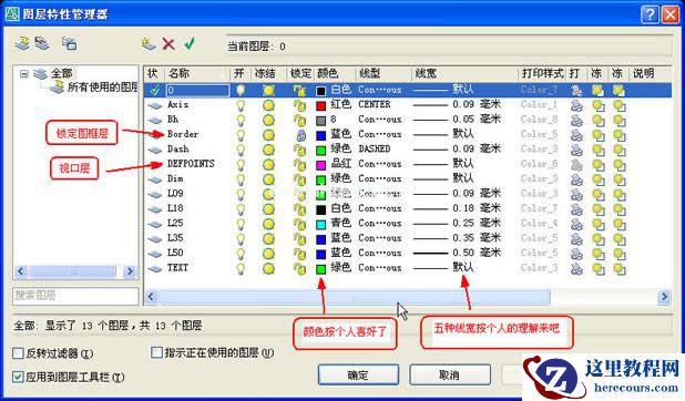 3、对象属性(颜色、线型、线宽)一律随层,便于修改对象。