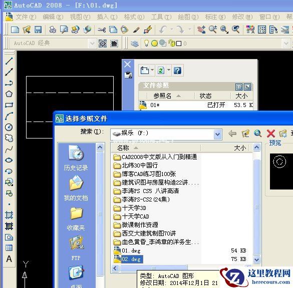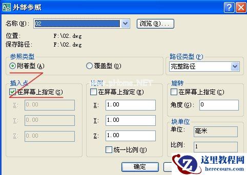 打开“选择参照文件”,找到02.dwg,选择“参照类型”为“附着型”,选择“插入点”为“在屏幕上指定”,在左视图的位置点击,左视图就附着在主视图的右侧。