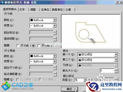 7在“机械”标注样式下,建立“直径”标注子样式,其大部分参数的设置与总体尺寸参数相同。但在“直线和箭头”标签中,将圆心标记的类型设为“无”,如下图所示。