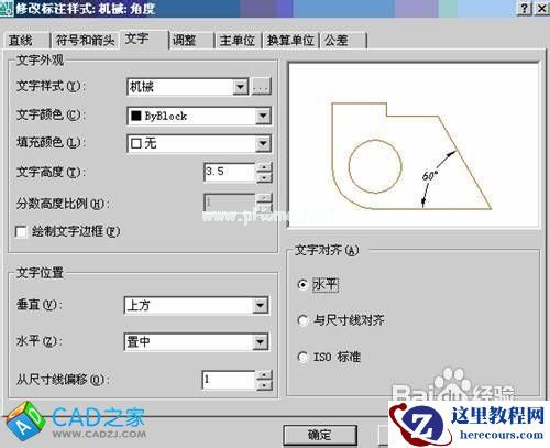 5在“机械”标注样式下,建立“角度”标注子样式,其大部分参数的设置与总体尺寸参数相同,只是“文字”标签中的内容有所不同,如下图所示。