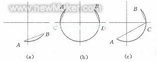 分析各种类型的圆弧,根据投影原理,圆弧的替代可分为三种情况:(1)若有圆弧段AB,只要圆弧与圆的水平直径无交点,就可用线段AB替代圆弧AB,如图1a所示。(2)若有圆弧段AB,只要圆弧与圆的水平直径存在两个交点C和D,可用三条线段AC、CD、DB替代圆弧AB,如图1b所示。(3)若有圆弧段AB,只要圆弧与圆的水平直径存在一个交点C,则可用两条线段AC、CB来替代圆弧AB,如图1c所示。