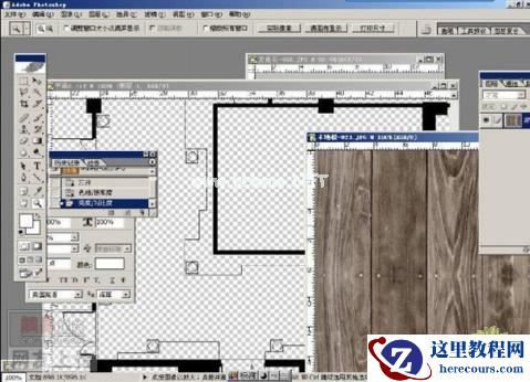 在PS打开材质的文件,例如是木纹,双击放大镜,以实际象素来显示图象,同时,要表现的平面图也要用实际尺寸显示。