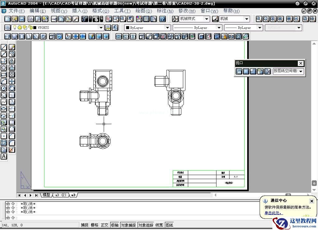 。返回模型窗口,把生成的三个视图剪切,在布局窗口里粘贴。如下图: