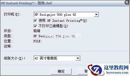 如果你的出图仪是卷筒纸,则可以直接勾选:“使用 HP Instant printing(TM)”这个选项,然后选择卷筒纸的尺寸,打印即可,它会根据你的出图仪自动调整纸张是横向或是纵向,自动选择过大尺寸的图纸,打印比例也不会偏差,见下图