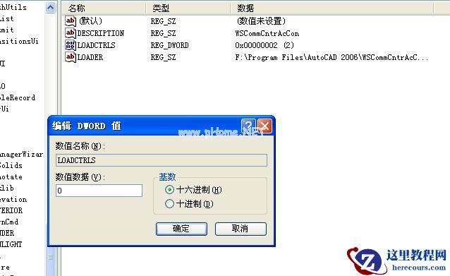 开始——运行,输入regedit 打开注册表编辑器,然后找到 HKEY_LOCAL_MACHINE——SOFTWARE——Autodesk——AutoCAD(2004或2006或其他)——R16.2——ACAD-4001:804——Applications——WSCommCntrAcCon(如图)