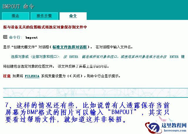 7、这样的情况还有些,比如说曾有人透露保存当前屏幕为BMP格式的图片可以输入“BMPOUT”,其实只要看过帮助文件,就知道这并非秘招。