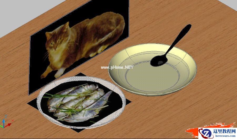 上面所述,仅适用于CAD2006及其以下版本。至于2007~2009版本,因已取新建消配景图命令,可用透明与不透明贴图功能实现,这里,仅将最近贴的“盘中餐”效果图为例,简单说明一下,为使表现猫和鱼就采用了此法:在三维图中创建一个平面和一个立面的面域,用透明与不透明相配套的贴图,附材质后如图1所示