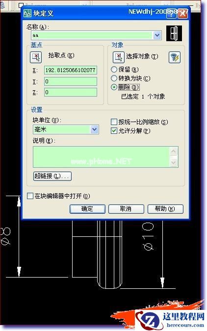 2、对象定义块,取名aa ,拾取点在圆心,确定