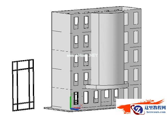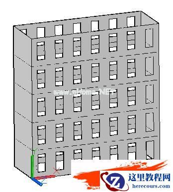 8、插入各层窗扇:用“三维阵列”命令,选择对象为是刚插入的底层左端第一个窗洞口的窗扇,阵列参数为:5行、7列、2层,各参数的间距,筒鼠标在图中指定,命令执行后就按上所有窗子了,如图-8所示