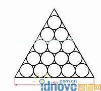 在一次AutoCAD竞赛中,一道题难住了不少人,题目的要求是建立一个边长为150的正三角形,并在正三角形中绘制15个圆,其中每个圆的半径相等,各个圆与三角形各边之间两两相切(图1)。