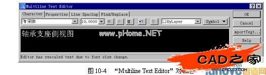 完成以上操作后,系统将弹出“MultilineTextEditor(多行文字编辑器)”对话框,如图10-4所示。在对话框的“Character(字符)”选项卡中,确认第一个列表框中为“宋体”项,并在第二个列表框中输入“10”,然后在编辑区中输入文字“轴承支座侧视图”。