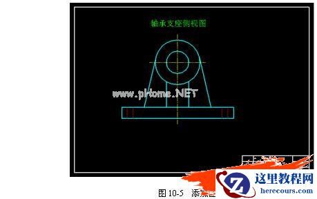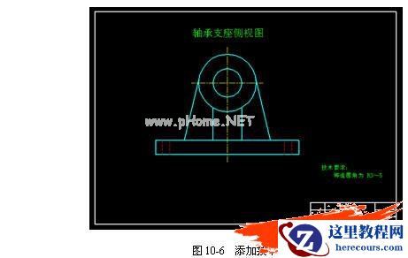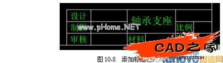 (6)重复上一步的操作,在标题栏内添加其他文字,如图10-8。注意,其中“轴承支座”字体高度为6,其他均为5。
