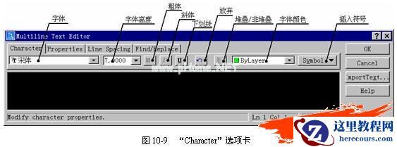 ?“Character(字符)”选项卡:如图10-9所示,在该选项卡中除了可以进行一些常规的设置,如字体、高度、颜色等,还包括其他一些特殊设置,如:
