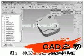 冲压模具按工艺性质可分为冲裁模、弯曲模、拉伸模、成形模等,无论何种模具,基本上都需要上、下模体、导向装置、压料装置、定位装置等,因此冲压模具CAD 系统是集冲压模具设计系统、冲压模具加工仿真、冲压模具工作仿真为一体的方便易用的设计系统,系统构成如图1 所示。图2 为该系统在Pro/ E环境下运行的一个界面。