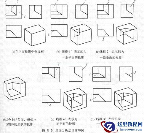 2、线面分析法。前面介绍的形体分析法,是从“体”的角度出发,分析组合体的视图,想像出组合体形状.但对于组合方式比较复杂的部分(如立体被多次切割、或多个立体相贯),常会发生有的线框同时对应其他视图中几个投影的情况。对此,需要从“线和面” 的角度出发,去分析组合体中该复杂部分立体表面的形状、线的意义及其相对位置,从而 深入细致地想像出组合体的各个表面相互位置关系。这种从“线和面”的角度出发、分析组合体视图的读图方法,就是线面分析法。