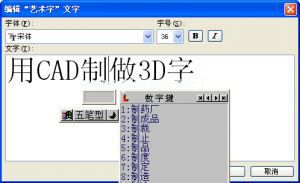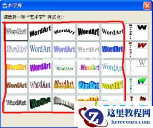 2、选择后会出现如下图2所示的对话框,我选的是第一中艺术字样式,可以看到,在下图中有本分是用红色线圈起来,我经过个人测试,红色线内的大部分艺术字样式均是可以用CAD制作3D效果字的。在这里,我推荐大家在选择艺术字样式的时候尽量选择没有阴影的(个人推荐用红色线内第一排的艺术字样式来制作),这样在导入到CAD中就不那么麻烦了!