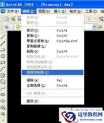 5、将你的Word办公工具窗口最小化,打开Auto CAD(在此,由于个人习惯和爱好,我使用的是Auto CAD2004,所以就以Auto CAD2004为标准)。依次操作:菜单栏→编辑(E)→选择性粘贴(S)。如下图5所示。