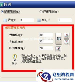 第二步阵列:将第一步阵列的结果为一整体作矩形阵列对象,3行1列,行距48,列距42,角度60度。