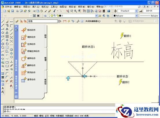 五、在“块编写选项板”的“动作”选项卡里点击“翻转动作”,AutoCAD底部的命令窗口提示“选择参数”,点击图上的文字“翻转状态”(就是水平的镜像轴);命令窗口接着提示“选择对象”,依次点击图形上除三角形下方的短横线以外的所有线条和属性(此时属性显示的是“标高”两个字)后回车;命令窗口又提示“指定动作位置”,拖动鼠标到附近空白处点击。