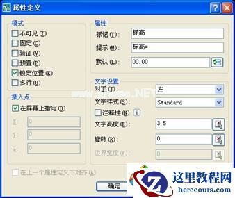 二、操作菜单“绘图”→“块”→“定义属性”,或者直接运行命令“attdef”,在“定义属性”窗口里的“标记”内输入“标高”,在“提示”内输入“标高=”,在“默认”内输入“00.00”,“文字高度”用3.5,按“确定”关闭窗口。
