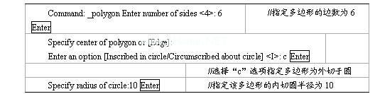 (3) 现在来绘制一个正六边形。选择”Draw(绘图)”工具栏中  图标,并根据提示在命令行中输入: