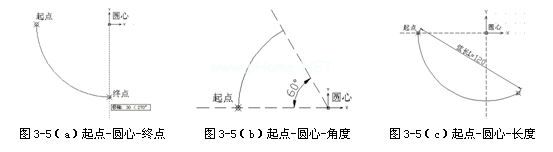 2)     指定中心点绘制圆弧,有以下三种方式创建所需圆弧对象: