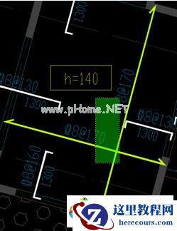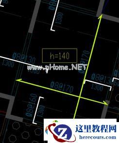 如果现在想将两条绿色的钢筋和标注删掉,房间是斜的,竖着的钢筋跟其他图形挨得比较近,好在图形还不算太密,用框选也可以,不过需要找一个合适的位置,如下图所示。如果对象再密一点,则稍有不慎就会选上其他对象。