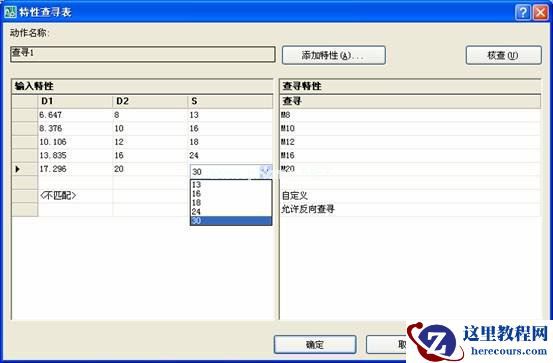 在右侧的查寻特性里依次输入“M8”、“M10”、“M12”、“M16”、“M20”。