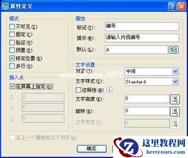 二、操作菜单“绘图”→“块”→“定义属性”,或者直接运行命令“attdef”,在“定义属性”窗口里的“标记”内输入“编号”,在“提示”内输入“请输入内视编号”,在“默认”内输入“A”,“文字高度”用5,“对正”选“中间”,按“确定”关闭窗口。捕捉并点击圆心,将属性文字放在圆心上。