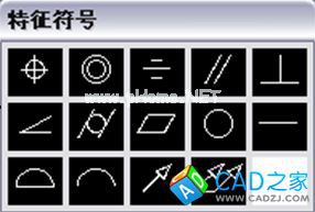 其中,“符号”选项组用于确定形位公差的符号。单击其中的小黑方框,AutoCAD弹出如下图所示的“特征符号”对话框。用户可从该对话框确定所需要的符号。单击某一符号,AutoCAD返回到“形位公差”对话框,并在对应位置显示出该符号。