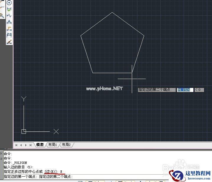 还可以通过边来绘制多边形,边的意思就是多边形的边长。点击多边形命令,输入5回车,输入E回车,点击绘图区一点,拉动鼠标输入边的值回车或者点击鼠标确定边长。