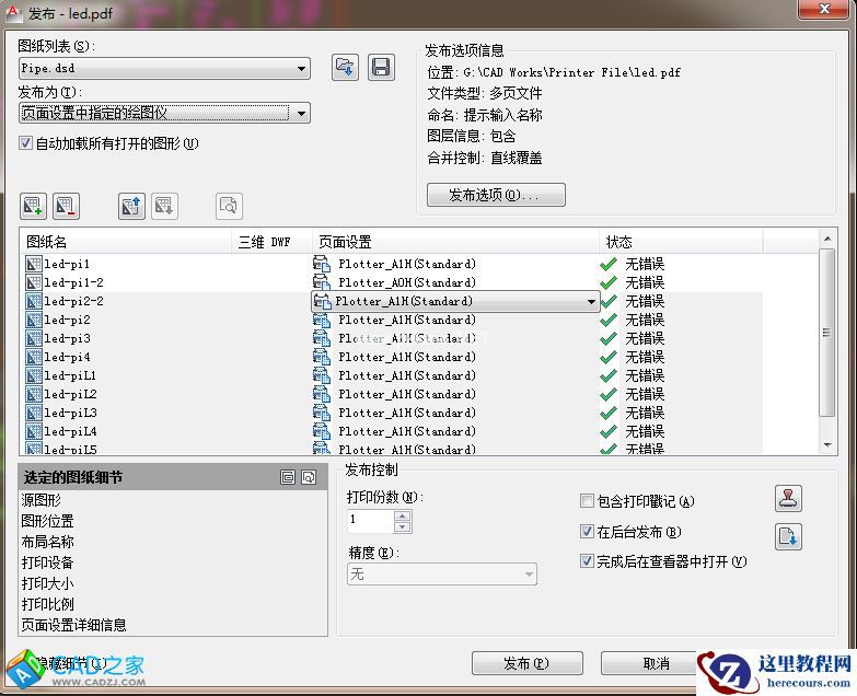在图纸集中,可以把一个项目的若干个dwg文件包含进来,而每个dwg文件可以选择其中的全部或部分布局。在图纸集中,可以选择发布到绘图仪、发布为PDF文件(2010前的版本需系统安装有PDF打印机)、发布为DWF文件,如图1。当然也可只选择图纸集中的一个或若干个布局来发布(批处理打印),如图2。用图纸集的方法不必打开dwg文件即可进行批处理打印。