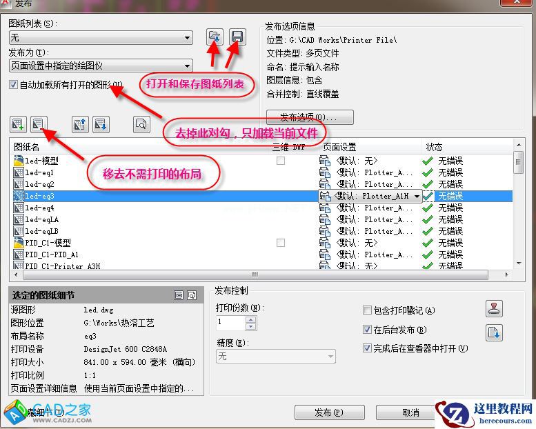 发出批处理打印命令后,AutoCAD会自动把当前所有打开的dwg的所有布局和每个dwg文件当前显示的模型空间都选择进来,生成一个批处理打印图纸列表。当然如果你在模型空间中打印过并把设置“应用到布局”过,模型空间就会以这个设置来作为打印对象。可以把不需要打印的布局从打印图纸列表中移去,强烈建议把模型空间移去,因为模型空间即使进行了打印设置,你也不会去记住是打印的哪一部分,且大多数人没有将打印设置“应用到布局”的习惯。如图3。图3中去掉“自动加载所有打开的文件”,则只会加载当前图形文件。把选择好的图纸列表保存下来,下次打印些图纸时,直接打开保存好的图纸列表文件(dsd文件)就行了。如图4。打开图纸列表文件时,可以选择是否包括当前打开的图形文件。图纸列表也可以加载没有打开的图形文件,如图5。把一个项目中的所有图形文件添加进来,移去不需打印的图纸(布局),然后保存图纸列表。效果和图纸集相类似,也就是殊道同归吧。图纸列表同样可以选择发布到绘图仪还是发布为PDF文件或DWF文件。