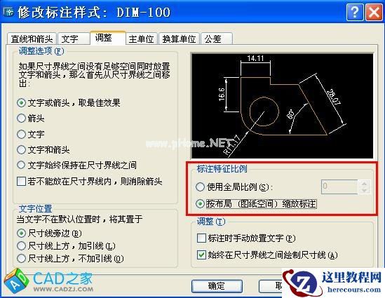 但是,我们千万不能忘了,这个尺寸标注不在图纸空间,尽管我们不在真正的模型空间标注,而是在图纸空间在激活的视口上标注,但尺寸标注作为ACAD对象却毫无疑问在模型空间。既然在模型空间,让它显示在图纸空间就不得不接受视口比例的缩放,因此,这个全局比例不能为1.0。