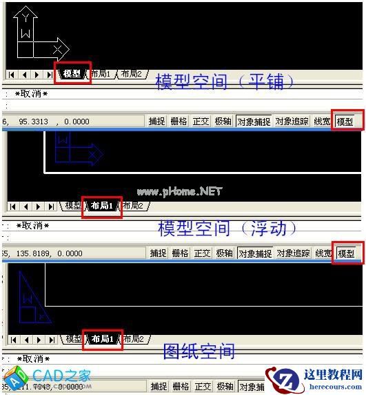 三个状态:模型空间(平铺),模型空间(浮动),图纸空间