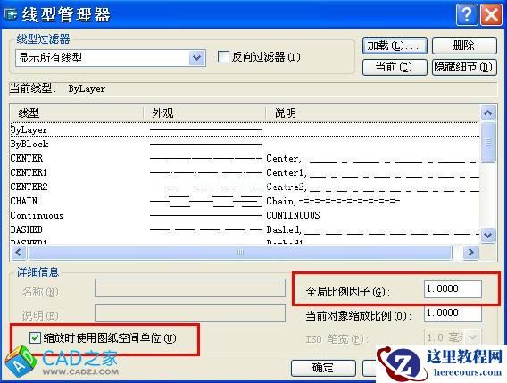 要达到这个要求,线型就必须由图纸空间来自动缩放,即在“缩放时使用图纸空间单位(U)”上打勾。但我们要注意到它的含义,它是以图纸空间的规格来设置线型比例了,图纸空间以1:1打印,那么"全局比例因子(G)"就是以图纸空间的大小来设置,如果线型规格就是按打印出的物理图纸上的规格设置的,其值就等于1.0,如果选用的是英制单位线型,公制单位出图,它就等于25.4。