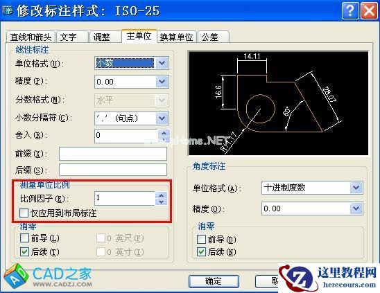 图中DIMLFAC=1,这是缺省设置值。如果我们把图上显示的尺寸值称为尺寸标注值的话,那么:尺寸标注值=实际测量值×测量单位比例因子。