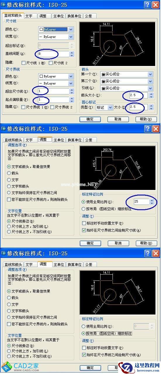 请各位注意上面图上的各参数的设置,如:文字高度=2.5,基线间距=8,超出尺寸线=1等。如果我们把这些统称为设置值,而在图上显示的大小称为显示值的话,那么:显示值=设置值×尺寸标注全局比例因子。