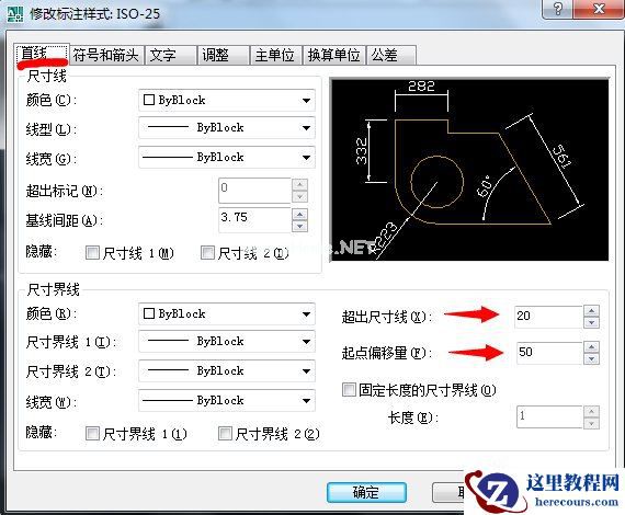 2、进入到修改标注样式窗口,逐次对直线、符号和剪头、文字、主单位设置即可。