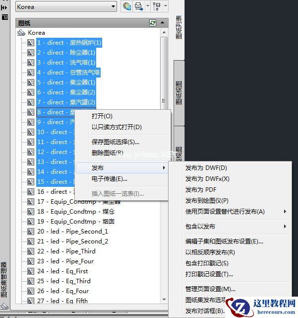 说图纸集的方法比较正规,是因为它更方便容易处理批处理打印问题,如可以在在图纸集中创建若干选择集,如一个项目中分不同的专业创建不同的选择集,批处理打印时,有选择地打印某一个选择集。一个专业也可以根据需要来创建选择集,如化工工艺设计图,按设备布置图、管道布置图、条件图等分别创建选择集。批处理打印时可方便地选择某个选择集来打印。