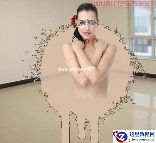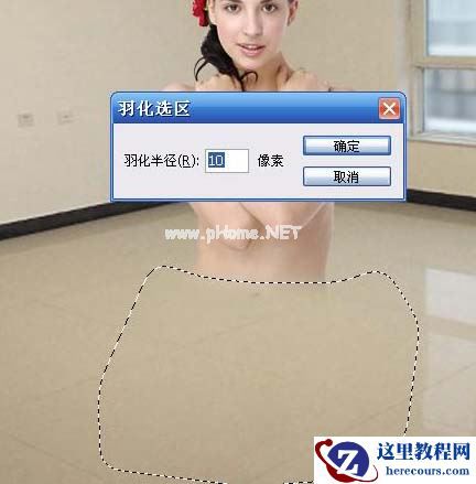 2、在人物图层,用套索工具选取人物下部分选区,如下图,按Ctrl + Alt + D羽化10像素后删除。