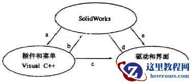 SolidWorks提供了多种二次开发方法,每种方法都各有所长,如果能将他们的优点集中起来,必将达到良好的效果.故考虑用VisualC++开发SolidWorks插件和菜单,用VisualBasic开发建模、装配等驱动程序和人机交互界面,之间的逻辑关系如图1所示.