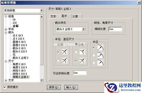 在“显示”页下,箭头样式的下拉列表中可以选择刚刚设置好的“箭头(企标)”,设置端线长度、引出折线长度等参数,设置半径、直径尺寸的表达方式。